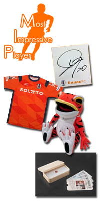 MIP投票でもらえる景品がパワーアップ! 今シーズンも全てのホームゲームにて実施!大好評の愛媛新聞×愛媛FC 連携企画!あなたが選ぶ!MIP! 投票者の中から抽選で当たるプレゼントが「愛媛新聞サンクスデー」といたしましてさらに追加!ぜひともみんなで応募しよう!! ★当選景品 ・2016レプリカユニフォーム ・・・ 2名様 ・選手のサイン色紙 ・・・ 5名様 ・虎一平くんぬいぐるみ ・・・ 3名様 ・地方新聞社厳選お取り寄せサイト「47CLUB」のカタログギフト ・・・ 5名様 ★MIPとは・・・ 当日試合観戦をした皆さまの投票で、その日最も印象に残った選手「MIP」を選出!見事MIPに輝いた選手は愛媛新聞社より賞金が贈呈されます!投票結果は試合2日後の愛媛新聞紙面で発表!QRコードからアクセスして投票しよう! ※投票は当日会場にて配布されるマッチディプログラムに記載されたQRコードからアクセスして行います。 ※投票の受付はキックオフ1時間後から翌日AM9時までです。 ※投票の際に入力されたニックネーム、コメントは紙面に掲載される場合があります。 ※引分、敗戦の場合もMIPの投票は受付いたします。 |