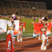 松山よさこい「風舞人」の華麗な舞! 松山よさこいの「風舞人(かぶと)」がニンスタで舞う! 選手入場直前のスタジアムを華麗に彩る! 【場所】スタジアム内 【時間】18:45頃 |
