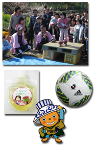 マッチタウン贈呈式 ★砥部町より 『七折梅製品詰め合わせ』を両チームに贈呈 品質の高さから「青いダイヤ」とも呼ばれている、砥部町特産品「七折小梅」の加工食品の詰め合わせです。 ■贈呈者 砥部町長 佐川 秀紀 様 砥部町議会議長 井上 洋一 様 |