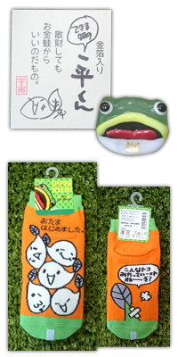 大人気!一平くんグッズが新登場! 新しい一平くんグッズが2アイテム登場! ★一平くん金箔お守り お金を使っても財布に『カエル』!金運UPのお守りです♪ 450円(税込) ★一平くんNEW靴下 おたまがいっぱい!一平くんのNEWデザイン靴下登場☆ 450円(税込) |