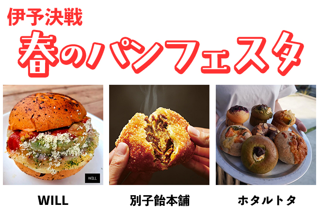 春のパンフェスタ愛媛県内のパン屋さん、キッチンカーがやってくる!「WILL」のバーガー、「別子飴本舗」のカレーパン、「ホタルトタ」のベーグル・マフィン などご堪能ください!