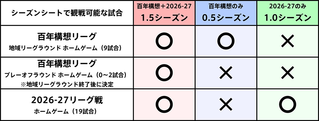 - ①「百年構想リーグ」と「2026-27リーグ」の両方の試合を観戦いただける『1.5シーズン』バージョン