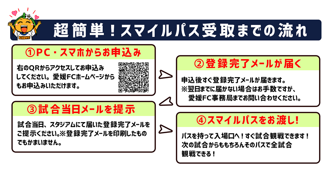 愛媛FCホームゲーム(百年構想リーグ・Jリーグ)の試合当日、スタジアムの「スマイルパス申込ブース」にて届いた登録完了メールをご提示ください。