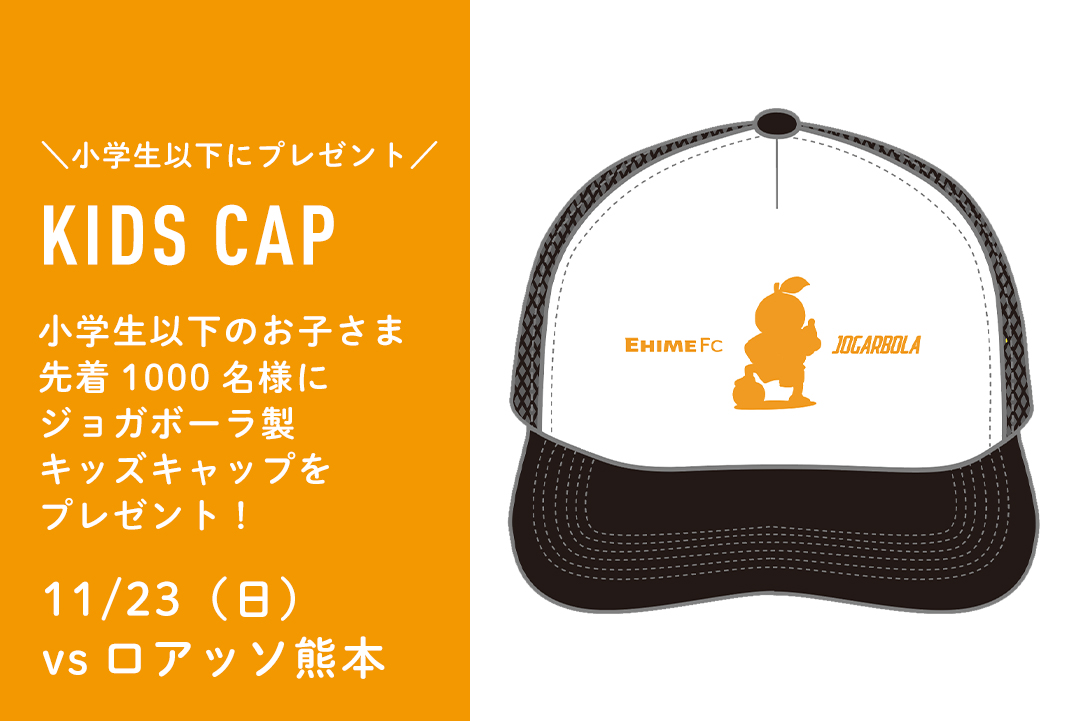 11月23日(日)の愛媛FCホームゲーム最終戦、ロアッソ熊本 戦において、小学生以下のお子さま先着1,000名様にジョガボーラ製の「愛媛FC 特製キッズキャップ」をプレゼントいたします!