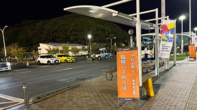 - 【1便目】JR松山駅10:40/松山市駅 10:45/一番町・三越向かい側10:50/立花駅前 11:00/松山IC高速入口・乙井橋バス停(そば吉様前)11:10(ニンジニアスタジアム 11:20頃着予定)