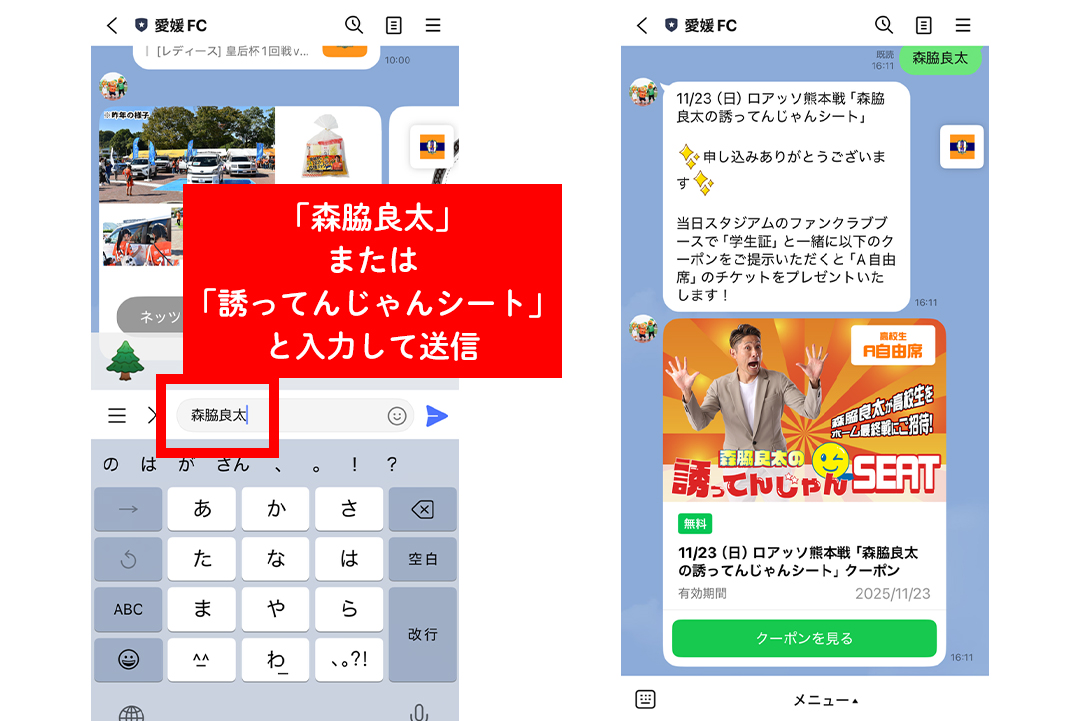 - ② 愛媛FC公式LINEのトーク画面で「森脇良太」または「誘ってんじゃんシート」と入力する。