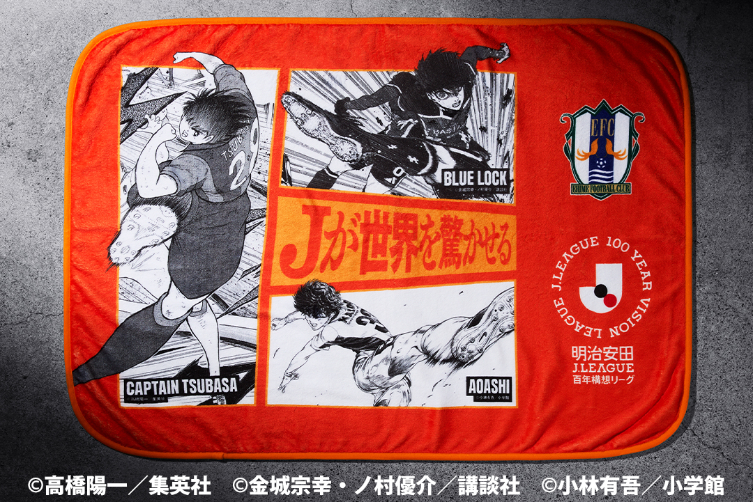 本企画は、シーズン移行に際して開催される特別な大会である「明治安田Jリーグ百年構想リーグ」を記念して実施されるものです。ブランケットのデザインには、日本が世界に誇るサッカー漫画「キャプテン翼」をはじめ、近年国内外で絶大な人気を誇る「ブルーロック」「アオアシ」の3つの作品との史上初のトリプルコラボレーションが実現しました。シーズン移行という大きな転換点を経て、Jリーグが今後さらに結果を出し、世界を驚かせるという意思を、3作品の主人公が放つ力強いシュートと重ね合わせ、メッセージとして発信していきます。