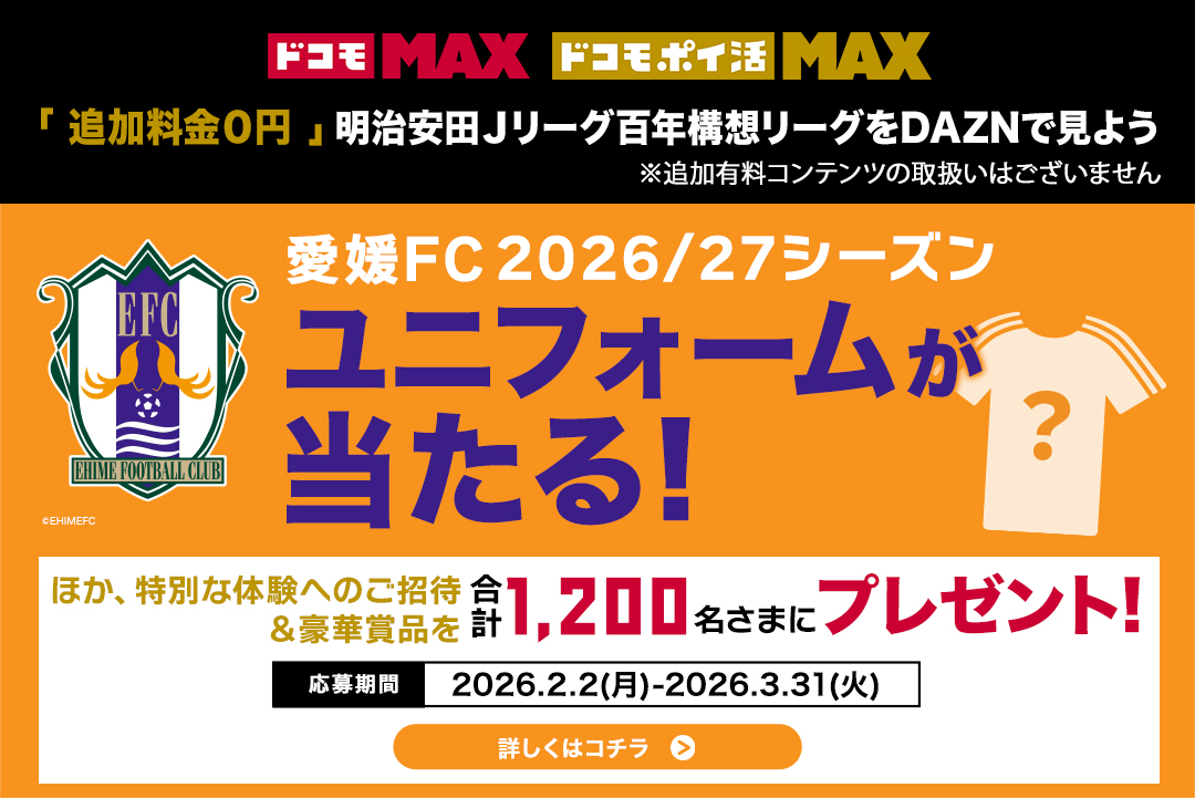 愛媛FCは、株式会社NTTドコモとの協業により、「ドコモ MAX」「ドコモ ポイ活 MAX」ご契約者様を対象としたキャンペーンを実施いたします。