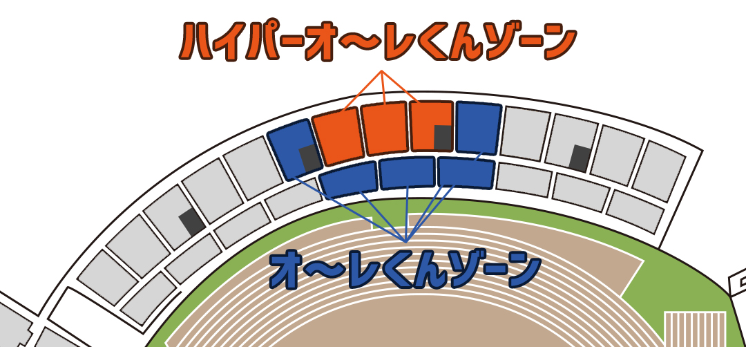 - 主に「立ち見応援」を推奨するエリアですので、ぜひ、立ち上がって選手達を熱く応援して下さい。更に、ゾーンの中央部(上図参照)については「ハイパー オ~レくんゾーン!」として「立ち見応援」を特に推奨しているエリアとなります。