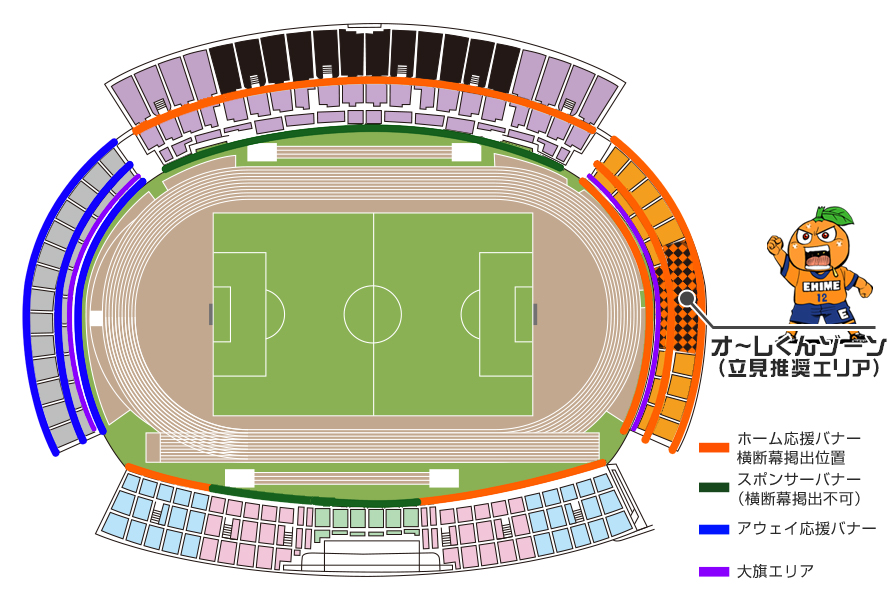 - 応援横断幕は、ホームサポーターは(上図の)オレンジ色、ビジターサポーターは青色で塗られているところに掲出可能です。