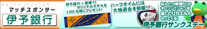 伊予銀行サンクスデーお楽しみ抽選会! マッチスポンサー伊予銀行プレゼンツ! 愛媛FC選手サイン入り公式球やサイン入りTシャツなどが当たるお楽しみ抽選会を開催! ■当選景品 ★愛媛FC選手サイン入り公式球 ・・・ 2名様 ★愛媛FC選手サイン入りTシャツ ・・・ 5名様 ★愛媛FCグッズ詰合せセット ・・・ 20名様 [セット内容] ・タオルマフラー(ファンシー) ・フラッグS ・メッシュキャップ(メッセージ) ・レザーキーホルダー |