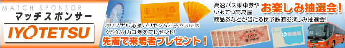 伊予鉄道ハーフタイムお楽しみ抽選会! マッチスポンサー 伊予鉄道 プレゼンツ! 高速バス乗車券やいよてつ髙島屋商品券などが当たる伊予鉄道ハーフタイムお楽しみ抽選会を開催! ■当選景品 ・高速バス 松山⇔大阪往復乗車券 1組2名様 ・高速バス 松山⇔神戸往復乗車券 1組2名様 ・いよてつ髙島屋商品券 5,000円分 5名様 ・ICい~カードチャージ(電子マネー) 2,000円分 5名様 |