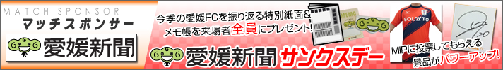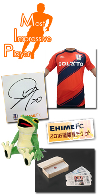 MIP投票でもらえる景品がパワーアップ! 今シーズンも全てのホームゲームにて実施!大好評の愛媛新聞×愛媛FC 連携企画!あなたが選ぶ!MIP! 投票者の中から抽選で当たるプレゼントが「愛媛新聞サンクスデー」といたしましてさらに追加!ぜひともみんなで応募しよう!! ★当選景品 ・2015レプリカユニフォーム(投票した選手のサイン入り)/Lサイズ ・・・ 2名様 ・投票した選手のサイン色紙 ・・・ 5名様 ・一平くんぬいぐるみ ・・・ 3名様 ・2016シーズンホーム開幕戦のペアチケット(※席種などは未定です) ・・・ 3名様 ・地方新聞社厳選お取り寄せサイト「47CLUB」のカタログギフト ・・・ 2名様 ★MIPとは・・・ 当日試合観戦をした皆さまの投票で、その日最も印象に残った選手「MIP」を選出!見事MIPに輝いた選手は愛媛新聞社より賞金が贈呈されます!投票結果は試合2日後の愛媛新聞紙面で発表!QRコードからアクセスして投票しよう! ※投票は当日会場にて配布されるマッチディプログラムに記載されたQRコードからアクセスして行います。 ※投票の受付はキックオフ1時間後から翌日AM9時までです。 ※投票の際に入力されたニックネーム、コメントは紙面に掲載される場合があります。 ※引分、敗戦の場合もMIPの投票は受付いたします。 |