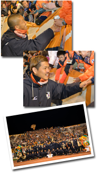 2015シーズンホーム最終戦セレモニー 試合終了後に今シーズン1年間の感謝の意を込めて、セレモニーを開催いたします。 選手・スタッフがトラックを1周して周る、サンクスウォークも行います! 最終戦セレモニー記念撮影! また、セレモニーの最後にはC席ゴール裏スタンドにて、全選手&サポーターとの記念撮影を行います。 バックスタンドでご観戦の方も試合終了後はC席ゴール裏スタンドにお集まりいただき、一緒に記念写真に写りましょう! |