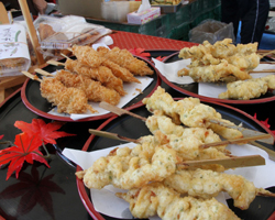 愛南かわはぎ「千尋丸」店主自ら獲ってきたかわはぎをカラッと揚げています。プリプリの身が特徴の商品です。 併せて、アコヤ貝(または真珠貝)の貝柱を使った串揚げもおススメです。 なかなか味わうことのできない逸品ですので、この機会にぜひ、ご賞味ください。