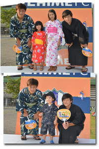 浴衣姿の選手と記念撮影会! 浴衣の人限定企画!浴衣姿の愛媛FC選手と一緒に記念撮影をしよう! いつもと違う選手との記念の一枚をぜひこの機会に収めてください!! 【内容】無料。大人から子どもまで誰でもOK! 【ルール】写真撮影のみです。サインは無しです。 【時間】17:10ごろから約30分で終了。 【注意】どんなに並んでも30分で終了です。それ以上は選手が倒れます。 ※浴衣を着ている方のみ対象となります。 ※こちらのカメラでも行いますが写真はお渡ししかねますので、自分用の撮影カメラをご持参ください。(撮影はスタッフが行います) ※参加選手は未定です。 |