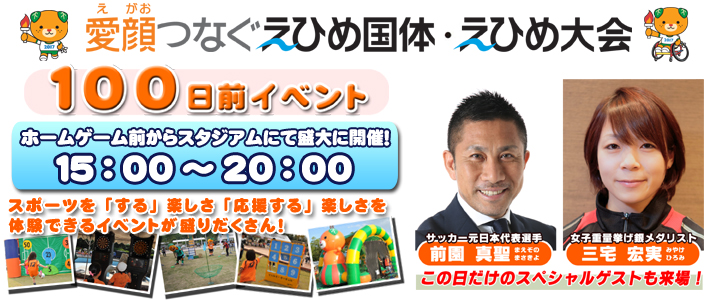 えひめ国体・えひめ大会出場選手壮行会 えひめ国体・えひめ大会出場チームの壮行会を実施します。 選手代表挨拶の後、知事、応援団長から激励の言葉をいただきます。 【場所】スタジアム内 【時間】16:50~17:15 |