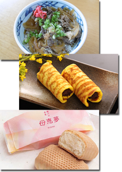 東温市のご当地グルメ!★ふるさと交流館 さくらの湯 東温市産のもち麦ごはんに東温産の和牛を乗せた名どんぶり「東温丼」! ★野間商店 とうおんマッチシティの定番!自家製のあんこをひとつひとつ心を込めて手作りしている「とらまき」! ★母恵夢 「ベビー母恵夢」を販売!昭和40年に誕生したベビー母恵夢は、小さなお子さまから年配の方まで気軽に楽しめる定番お菓子です。 |