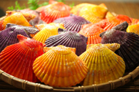 マッチタウン贈呈式 ★愛南町より 『ヒオウギ貝』を両チームに贈呈 愛南町由良半島の沖で飼育しています。食卓をオレンジ、黄、赤、紫の100%天然色で彩ります。特徴は見た目の華やかさと、磯の香り、ホタテに似た食感が挙げられます。また、平成19年3月15日に県のブランド認定の「愛」あるブランド産品認定を受けております。 ■贈呈者 愛南町長 清水 雅文 様 |