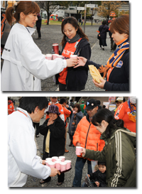 マッチスポンサー試合前贈呈式 ★JALより 『うどんですかい』を両チームに贈呈 ■贈呈者 日本航空株式会社 松山支店 副支店長 佐孝卓也 様 日本航空客室乗務員 杉原 久乃 様 |