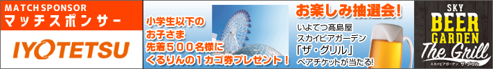 伊予鉄グループ ハーフタイムお楽しみ抽選会! マッチスポンサー 伊予鉄グループ プレゼンツ! いよてつ髙島屋「スカイビアガーデン ザ・グリル」のペアチケットが当たる伊予鉄道ハーフタイムお楽しみ抽選会を開催! ■当選景品 ・いよてつ髙島屋「スカイビアガーデン ザ・グリル」チケットペア 8組16名様 ※抽選会は入場ゲートにてお配りする無料の冊子「マッチデイプログラム」を使用します。 【場所】スタジアム内 【時間】ハーフタイム |
