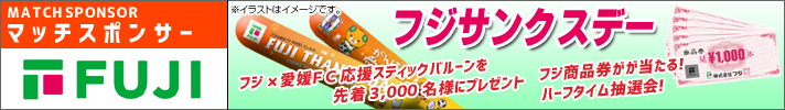 フジからの来場者プレゼント! マッチスポンサー フジからの来場者プレゼント! フジオリジナル愛媛FC応援スティックバルーンを先着3,000名様にプレゼント! 選手入場の時や試合中このスティックバルーンをバンバンたたいて選手を応援しよう! 【場所】メインスタンド/バックスタンド 各入場口 【時間】17:00~(開門時※先行入場は16:45) |