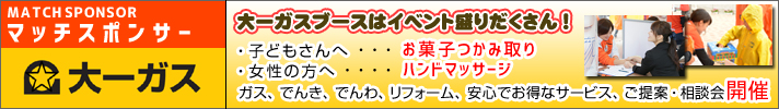 大一ガスブースが登場! スタジアム外の大一ガス特設ブースではお楽しみイベント盛りだくさん! ■わくわくキッズコーナー お菓子のつかみ取りなどお子さまが楽しめるコーナーが登場! ■女性の方限定 ハンドトリートメント無料体験コーナー プロのエステティシャンがあなたの手をやさしくマッサージいたします。至福のリラクゼーションサービスで日頃の疲れを癒してください。 ■相談コーナー ガス、でんき、でんわ、リフォーム、安心でお得なサービス、ご提案・相談会を開催! 【場所】スタジアム外 イベント広場 大一ガスブース |