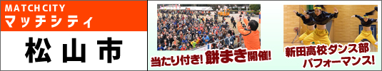 マッチシティ松山市 お楽しみ抽選会! 松山市プレゼンツ! 道後温泉別館 飛鳥乃湯泉ペアチケットや松山の特産品などが当たるハーフタイムお楽しみ抽選会を開催! 【当選景品】 ★道後温泉別館 飛鳥乃湯泉ペアチケット ・・・ 10組20名 ★瀬戸内の銀鱗煮干しセット ・・・ 5名 ★道後焼酎 瀬戸内の銀鱗煮干し ・・・ 3名 ★道後オンセナート2018 イチハラヒロコタオルセット ・・・ 12名 ★日本の名湯 道後 ・・・ 10名 ※抽選会は入場ゲートにてお配りする無料の冊子「マッチデイプログラム」を使用します。 【場所】スタジアム内 【時間】ハーフタイム |