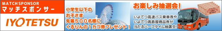 伊予鉄グループ ハーフタイムお楽しみ抽選会! マッチスポンサー 伊予鉄グループ プレゼンツ! いよてつ高速バス乗車券やいよてつ髙島屋商品券が当たる抽選会を開催! ■当選景品 ・高速バス 松山⇔大阪往復乗車券ペア ・・・ 1組2名様 ・高速バス 松山⇔神戸往復乗車券ペア ・・・ 1組2名様 ・いよてつ髙島屋商品券 5,000円分 ・・・ 10名様 ※抽選会は入場ゲートにてお配りする無料の冊子「マッチデイプログラム」を使用して行います。 【場所】スタジアム内 【時間】ハーフタイム |